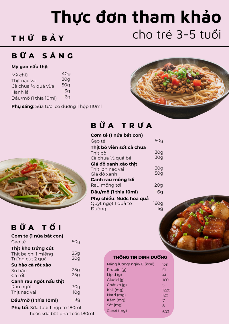 Giai đoạn 3–5 tuổi là thời kỳ trẻ phát triển nhanh cả về thể chất lẫn trí tuệ, nhu cầu năng lượng và dinh dưỡng tăng cao. Một thực đơn hợp lý, cân đối giữa các nhóm thực phẩm sẽ giúp trẻ ăn ngon, tăng trưởng tốt và phòng tránh thiếu vi chất. Bài viết giới thiệu thực đơn mẫu cho trẻ 3–5 tuổi được xây dựng dựa trên khuyến nghị của Viện Dinh dưỡng, đảm bảo đủ năng lượng, cân đối giữa các nhóm thực phẩm và phù hợp với khẩu phần khuyến nghị hằng ngày cho lứa tuổi mầm non.