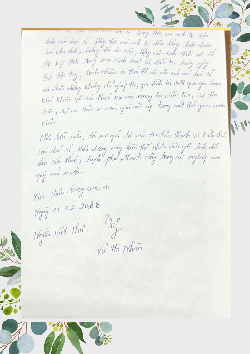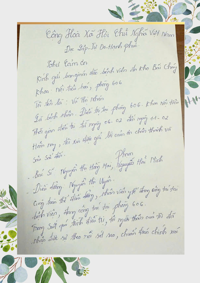 Trong thư, bệnh nhân bày tỏ sự biết ơn sâu sắc tới Ban Giám đốc bệnh viện và đặc biệt là đội ngũ y bác sĩ, điều dưỡng trực tiếp điều trị, chăm sóc mình trong suốt thời gian nằm viện. Bệnh nhân gửi lời cảm ơn tới các bác sĩ: Nguyễn Thị Hồng Mai, Nguyễn Hải Minh cùng điều dưỡng Nguyễn Thị Uyên và toàn thể nhân viên y tế đang công tác tại phòng 606.