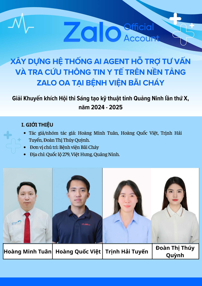Trong bối cảnh chuyển đổi số y tế mạnh mẽ, với mục tiêu nâng cao trải nghiệm dịch vụ y tế, Bệnh viện Bãi Cháy đã nghiên cứu, xây dựng và triển khai hệ thống AI Agent hỗ trợ tư vấn và tra cứu thông tin y tế trên nền tảng Zalo Official Account (Zalo OA). Giải pháp đã được trao Giải Khuyến khích tại Hội thi Sáng tạo kỹ thuật tỉnh Quảng Ninh lần thứ X (2024 – 2025).