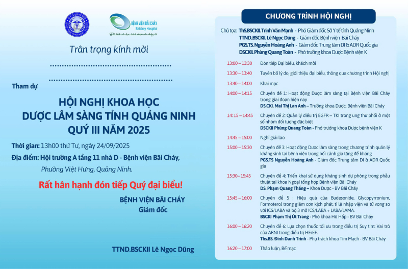 - Thời gian: 13h00 - 19h00, ngày 24 tháng 5 năm 2026 - Địa điểm: Hội trường A tầng 11 nhà D - Bệnh viện Bãi Cháy, Phường Việt Hưng, Quảng Ninh.