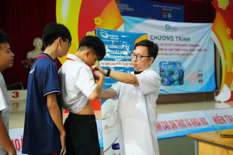 Đặc biệt, 11 trường hợp học sinh được chẩn đoán mắc dị tật lõm ngực có chỉ định phẫu thuật đã được BSCKII Hoàng Minh Tuân – Trưởng phòng quản lý chất lượng, Bệnh viện Bãi Cháy tư vấn chuyên sâu về phương pháp điều trị - phẫu thuật Nuss cải tiến đang được triển khai tại Bệnh viện Bãi Cháy. Đây là kỹ thuật hiện đại, ít xâm lấn, không cần cắt xương hay sụn, giúp chỉnh hình lồng ngực hiệu quả, cải thiện chức năng hô hấp và thẩm mỹ, rút ngắn thời gian hồi phục, mang lại chất lượng cuộc sống tốt hơn cho người bệnh.