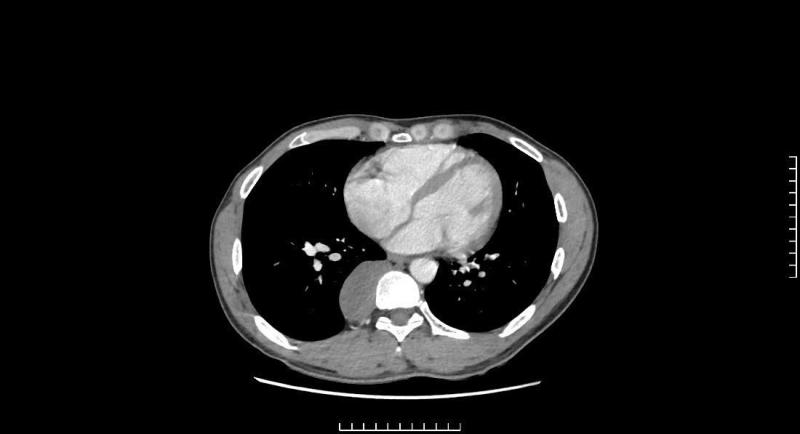 Bệnh nhân Thân V Q (38 tuổi, ở xã Tây Yên Tử, tỉnh Bắc Ninh) xuất hiện tình trạng khó thở, mệt mỏi, hụt hơi, khó nói, tê tay phải kèm các cơn giật mình vùng thân khi ngủ trong vài tháng nay. Gần đây, triệu chứng đau ngực tăng, thi thoảng giật mình thức giấc nên bệnh nhân đã đến Bệnh viện Bãi Cháy thăm khám. Người bệnh được thăm khám lâm sàng và thực hiện các xét nghiệm thăm dò chuyên sâu. Kết quả chụp CTscanner và MRI lồng ngực phát hiện khối u kích thước lớn 33x90x32mm nằm sát cột sống D7-D11. Các bác sĩ đã hội chẩn và chẩn đoán bệnh lý u trung thất sau, theo dõi u thần kinh.
