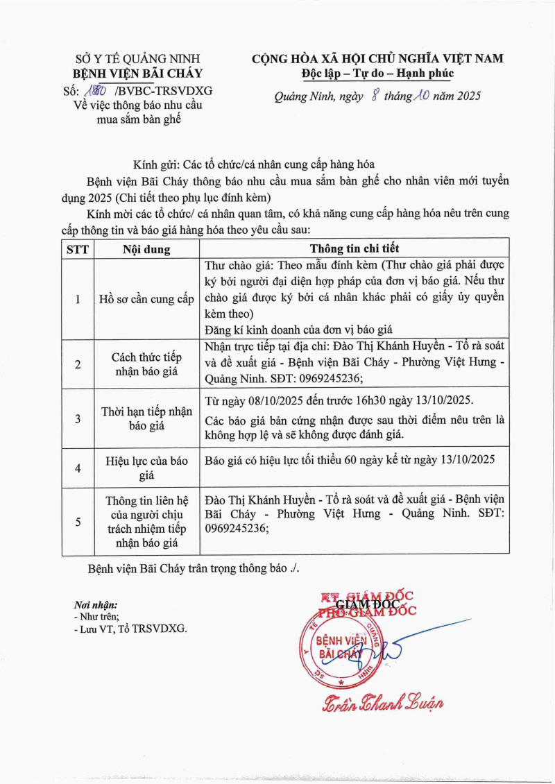 Thông báo số 1880 về nhu cầu mua sắm bàn ghế