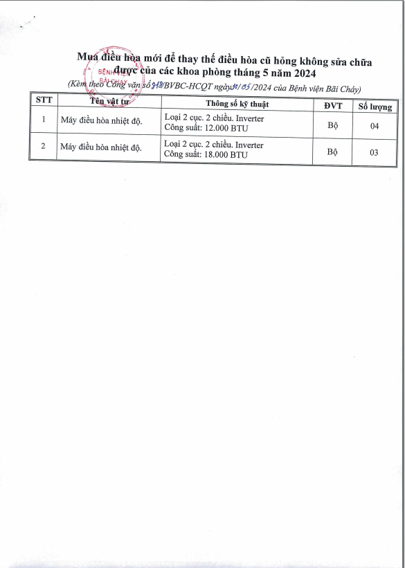 Thông báo số 878 về nhu cầu mua điều hòa mới thay thế điều hòa cũ không sửa được của các khoa phòng tháng 5 năm 2024 2024/05/30 02:46