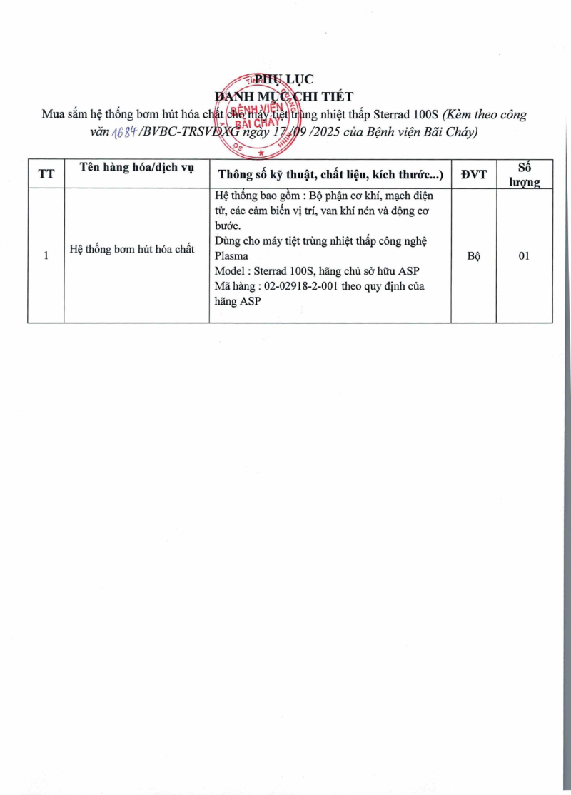Thông báo 1684 nhu cầu mua sắm hệ thống bơm hút hóa chất cho máy tiệt trùng nhiệt thấp