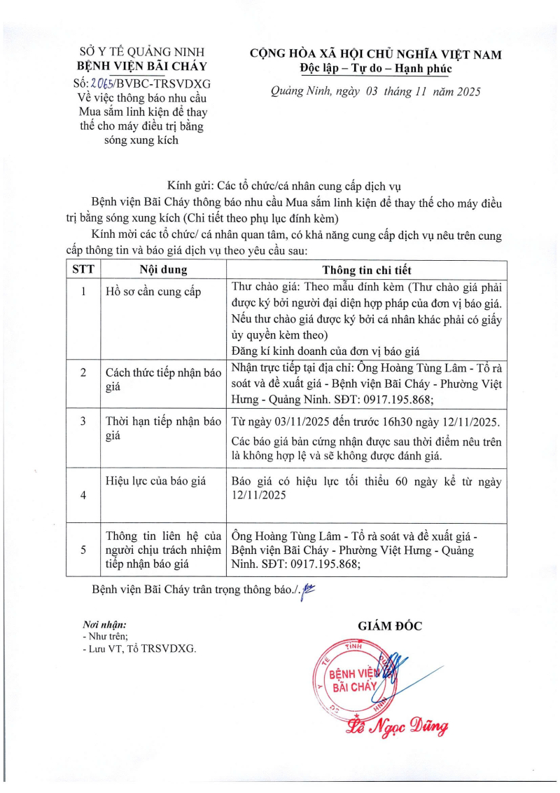 Thông báo 2065 nhu cầu mua sắm linh kiện để thay thế cho máy điều trị bằng sóng xung kích