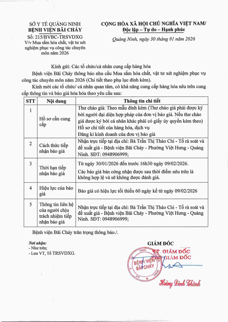 Thông báo 215 mua sắm hóa chất xét nghiệm phục vụ công tác chuyên môn năm 2026