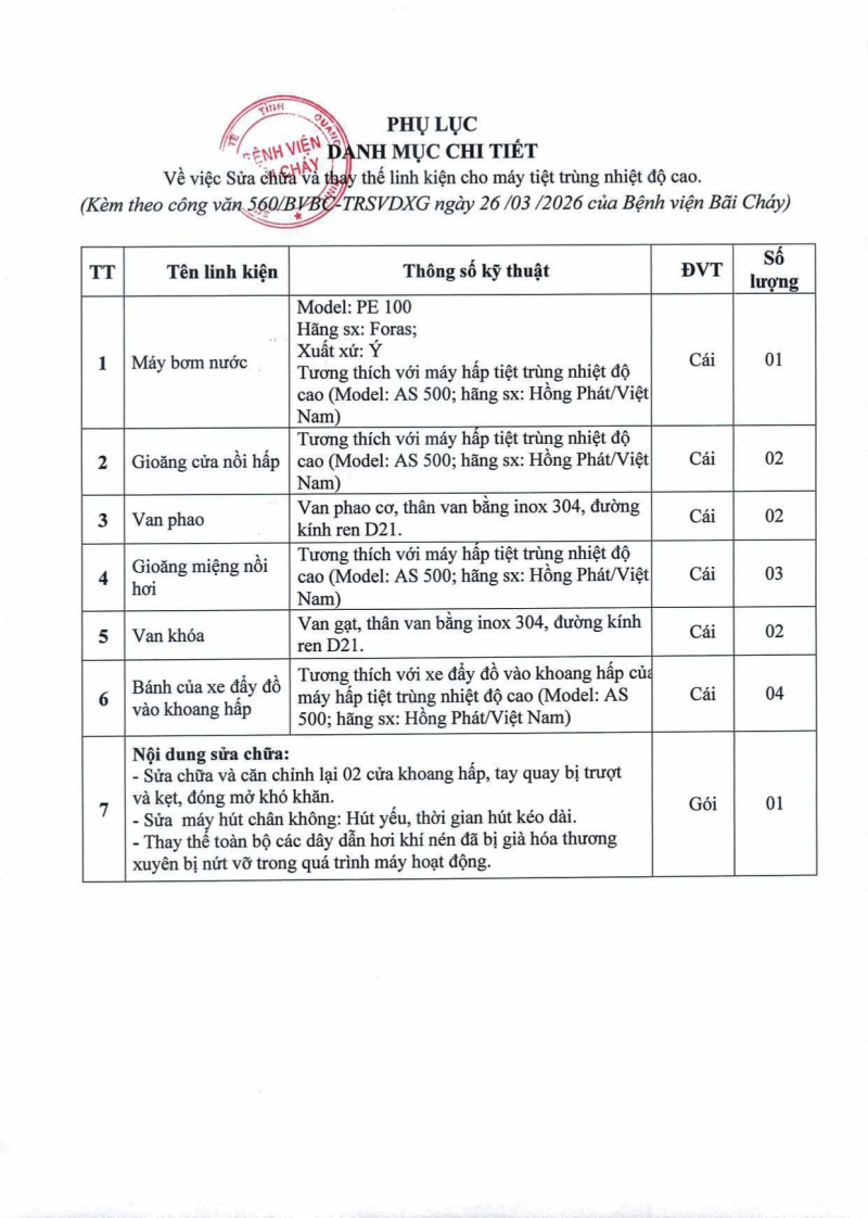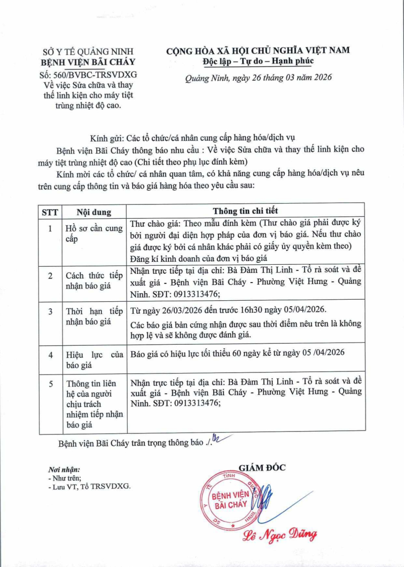 Thông báo 560 sửa chữa và thay thế linh kiện cho máy tiệt trùng nhiệt độ cao Hôm nay 07:03 Thông báo 560 sửa chữa và thay thế linh kiện cho máy tiệt trùng nhiệt độ cao