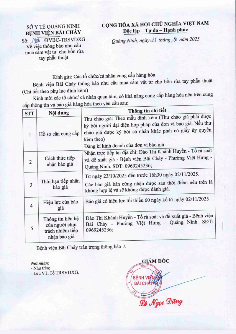 Thông báo số 1986 về nhu cầu mua sắm vật tư cho bồn rửa tay phẫu thuật