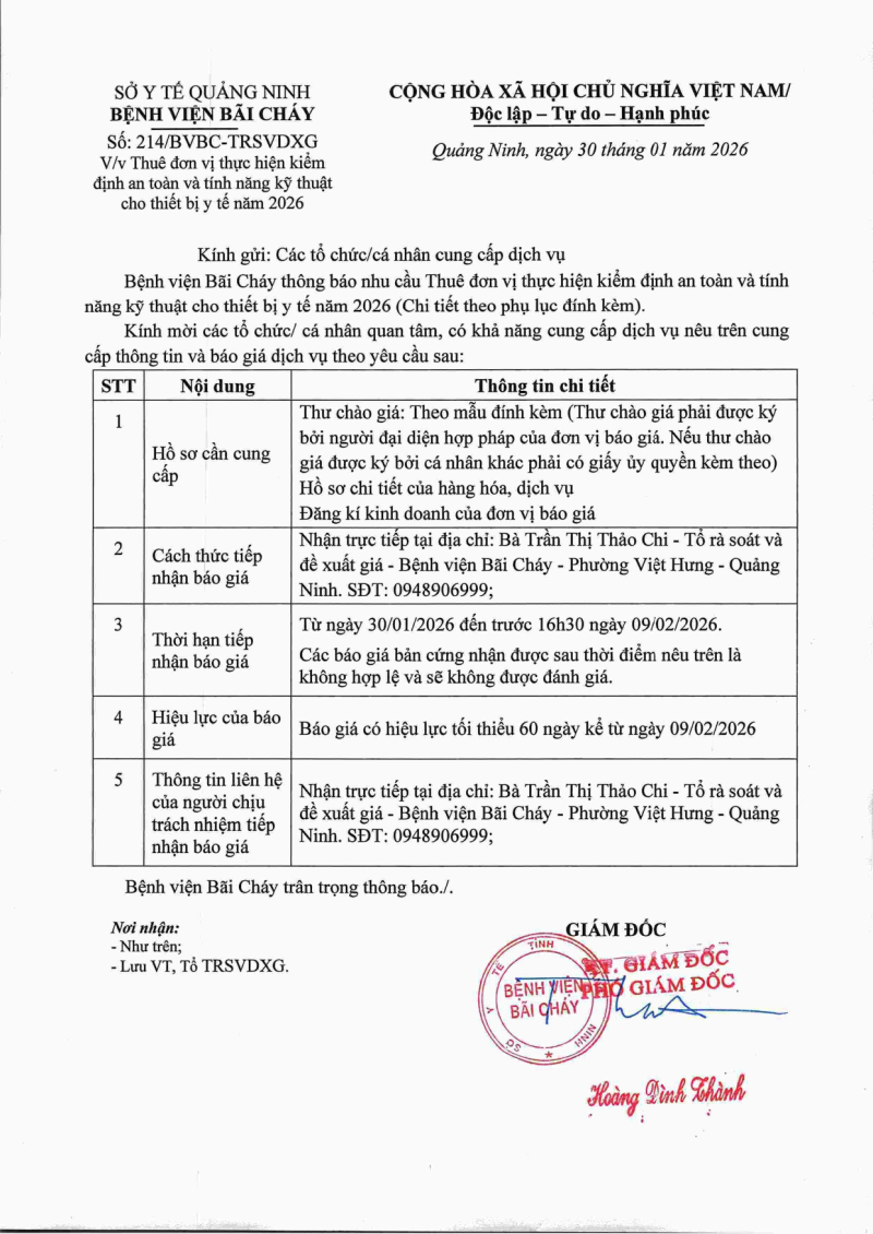 Thông báo số 214 về nhu cầu thuê đơn vị kiểm định an toàn và tính năng kỹ thuật cho thiết bị y tế năm 2026 Hôm nay 08:53