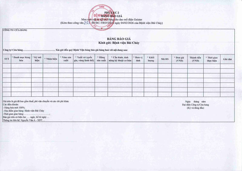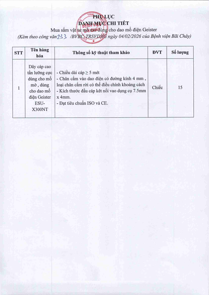 Thông báo số 233 về nhu cầu mua sắm vật tư mổ mở dùng cho dao mổ điện Geister