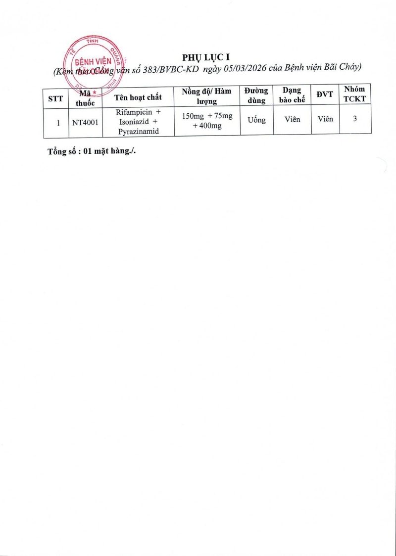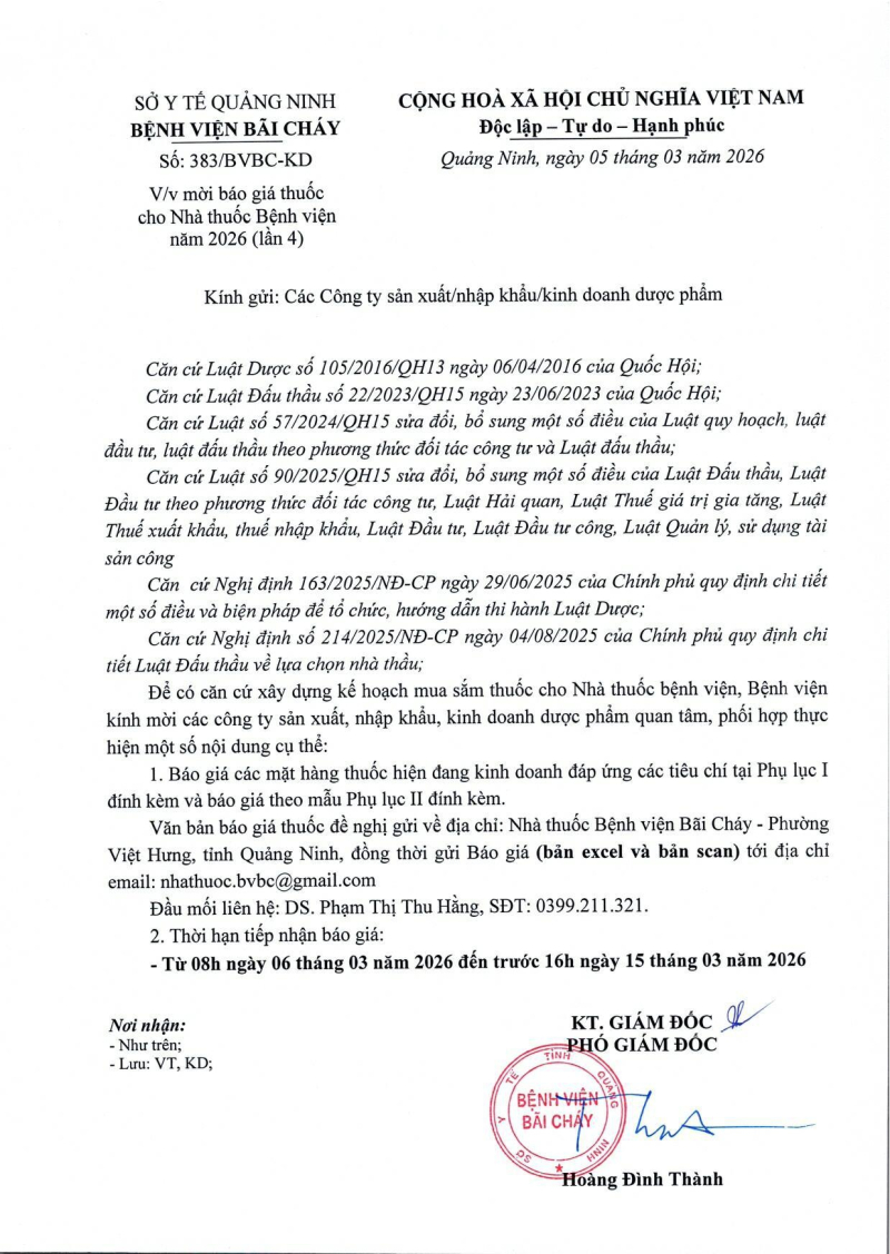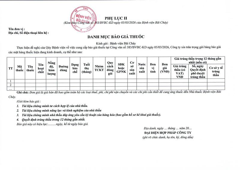 Thông báo số 383 về nhu cầu báo giá thuốc cho nhà thuốc bệnh viện năm 2026 lần 4