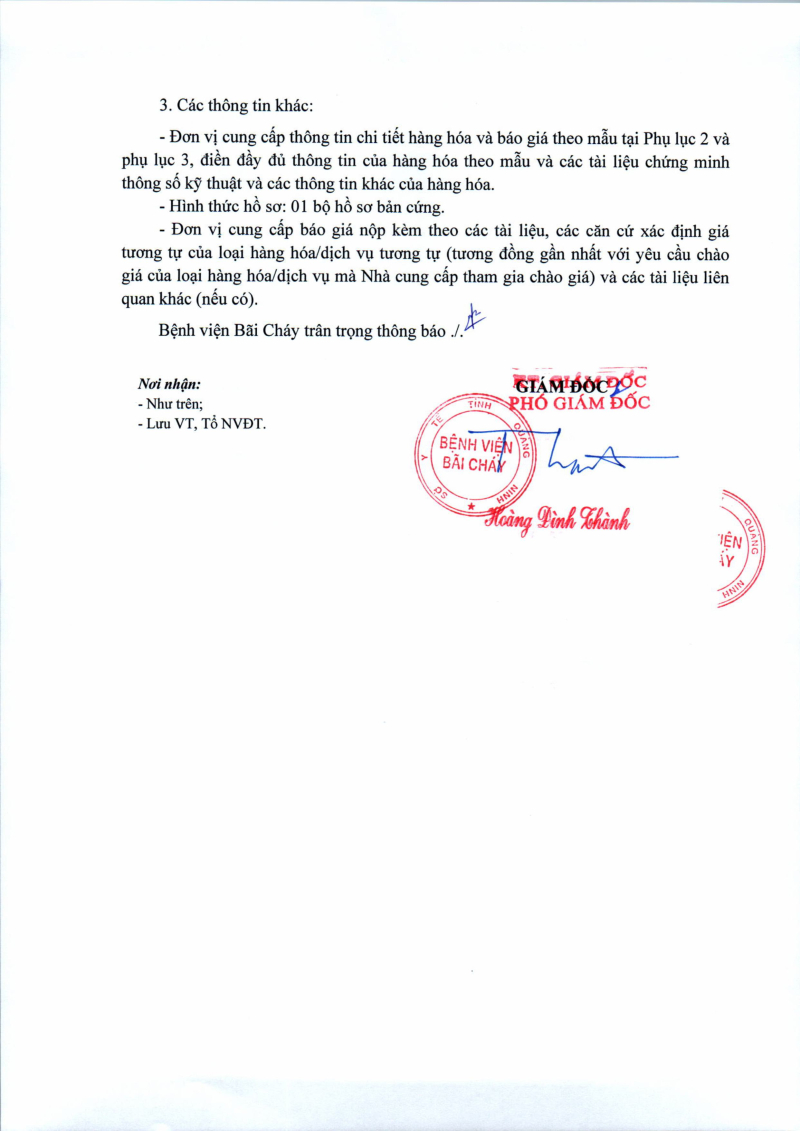 Thông báo số 441 về nhu cầu cung cấp vật tư để thực hiện phương án cung cấp điện cho các thiết bị tại khu vực y tế trung tâm tầng 8 nhà B Bệnh viện Bãi Cháy