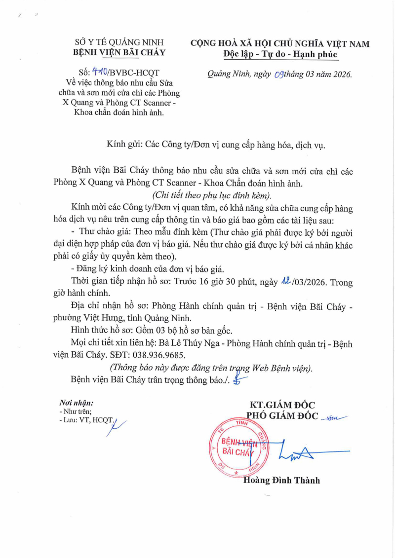 Thông báo số 410 về nhu cầu sửa chữa và sơn mới cửa chì các phòng X Quang và phòng CT Scanner khoa Chẩn đoán hình ảnh 2026/03/09 07:21