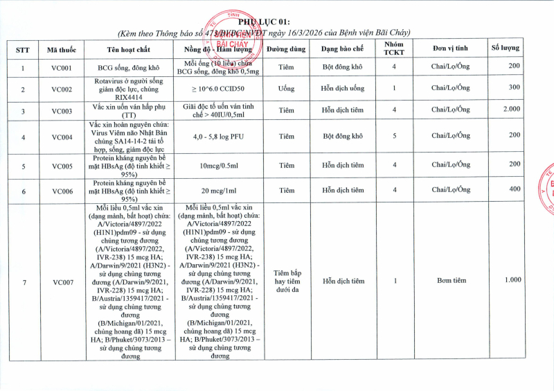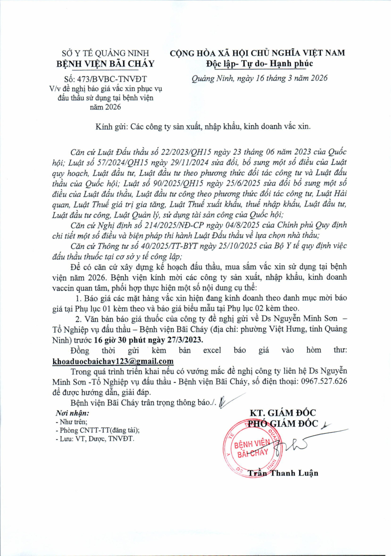 Thông báo số 473 về nhu cầu báo giá vắc xin phục vụ đấu thầu sử dụng tại bệnh viện năm 2026 Hôm nay 09:49