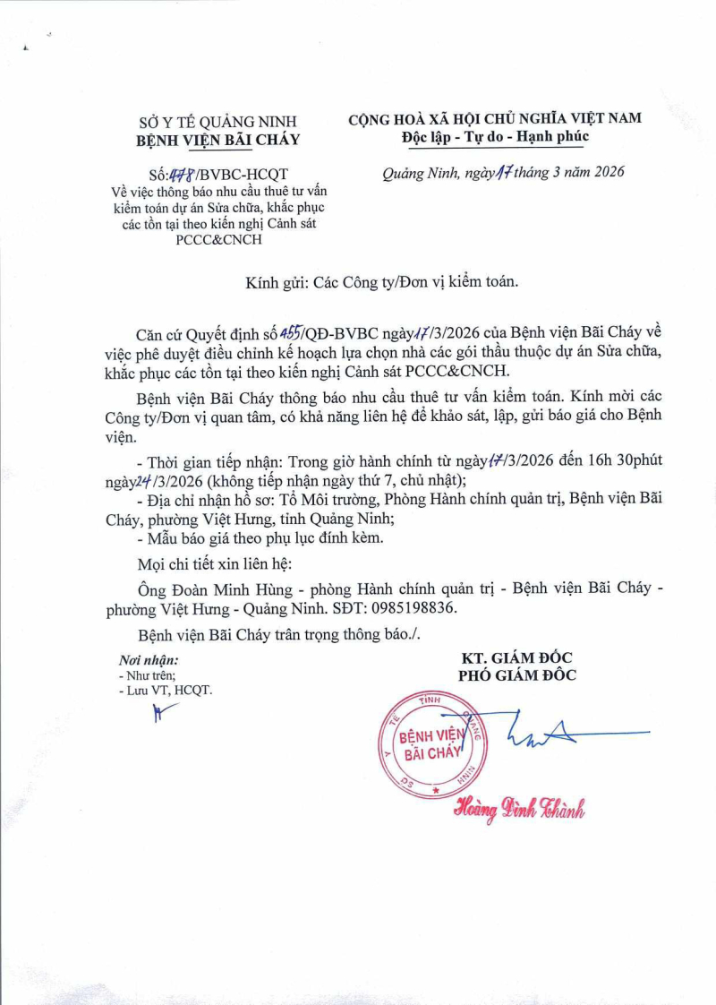 Thông báo số 478 về nhu cầu thuê tư vấn kiểm toán dự án sửa chữa, khắc phục các tồn tại theo kiến nghị Cảnh sát PCCC&CNCH 2026/03/17 09:20