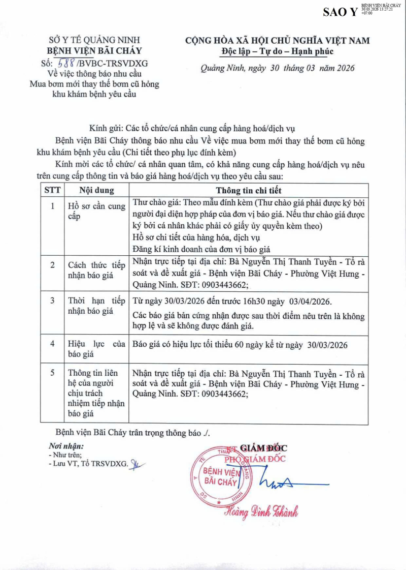 Thông báo số 588 về nhu cầu mua bơm mới thay thế bơm cũ hỏng khu khám bệnh yêu cầu