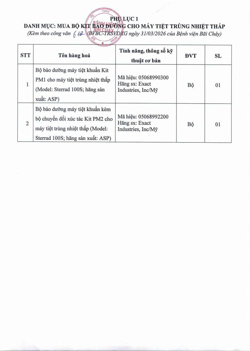 Thông báo số 612 về nhu cầu mua bộ KIT bảo dưỡng cho máy tiệt trùng nhiệt thấp