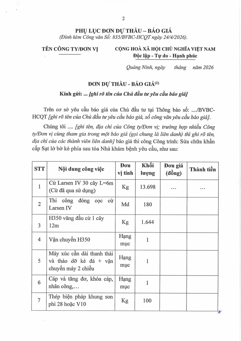 Thông báo số 835 về nhu cầu thi công công trình: Sửa chữa khẩn cấp sạt lở bờ kè phía sau tòa nhà khám bệnh yêu cầu tại Bệnh viện Bãi Cháy Hôm nay 13:55