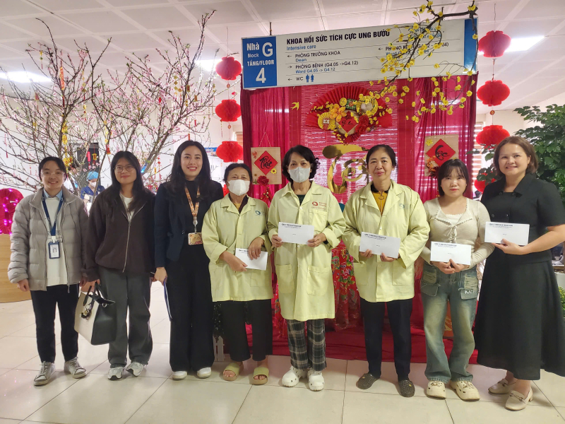 Đoàn thiện nguyện đã trao 30 suất quà với tổng trị giá 30 triệu đồng đến người bệnh đang điều trị tại các khoa: Khoa Ung bướu 1, Ung bướu 2, Xạ trị-Y học hạt nhân, Hồi sức tích cực Ung bướu, Hồi sức tích cực – Chống độc, Ngoại thần kinh – Lồng ngực tại Bệnh viện Bãi Cháy.