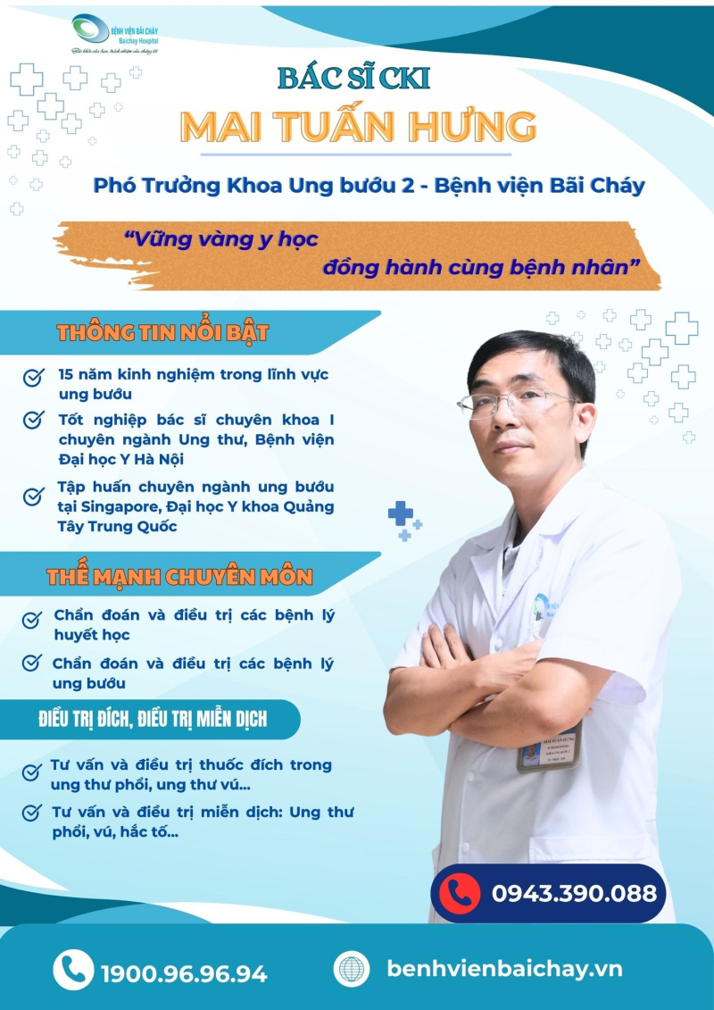 Với hơn 15 năm kinh nghiệm trong lĩnh vực ung bướu, bác sĩ Mai Tuấn Hưng được đào tạo bài bản chuyên ngành Ung thư tại Đại học Y Hà Nội và từng tham gia nhiều chương trình đào tạo, tập huấn chuyên sâu tại Singapore và Trung Quốc. Bác sĩ có thế mạnh trong chẩn đoán và điều trị các bệnh lý ung bướu, huyết học; tư vấn và triển khai các phương pháp điều trị hiện đại như liệu pháp nhắm trúng đích trong ung thư phổi, ung thư vú, cũng như liệu pháp miễn dịch trong điều trị các bệnh ung thư như phổi, vú, hắc tố.