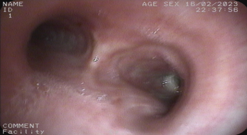 Trước nhập viện bệnh nhân bị ho sặc, tức ngực, khó thở. Tại Bệnh viện Bãi Cháy, bệnh nhân được thăm khám lâm sàng, thực hiện các xét nghiệm, chẩn đoán hình ảnh. Kết quả chụp CT scanner lồng ngực phát hiện vị trí phế quản phải có hình ảnh dị vật phản quang kích thước 17x12mmm. Các bác sĩ đã hội chẩn chuyên khoa hô hấp và chỉ định can thiệp nội soi phế quản để gắp dị vật.