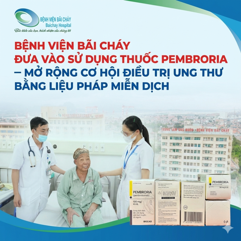 Không ngừng cập nhật và ứng dụng các tiến bộ y học trong chẩn đoán và điều trị ung thư, mới đây Bệnh viện Bãi Cháy đã chính thức đưa vào sử dụng thuốc điều trị miễn dịch Pembroria, chứa hoạt chất pembrolizumab do Liên bang Nga sản xuất theo giấy phép lưu hành của Cục Quản lý Dược – Bộ Y tế. Việc triển khai thuốc giúp người bệnh ung thư tại Quảng Ninh và các khu vực lân cận có thêm cơ hội tiếp cận các phương pháp điều trị miễn dịch hiện đại ngay tại địa phương.