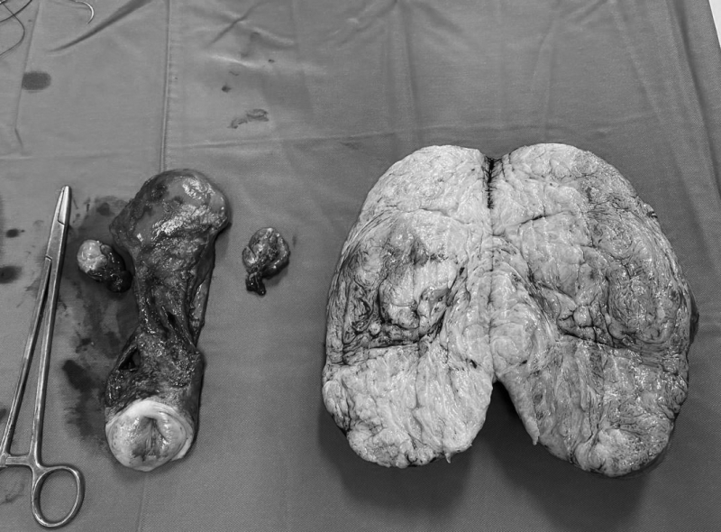 Bệnh nhân phát hiện u xơ tử cung cách đây 1 năm nhưng không điều trị. Đợt này vùng bụng đau tức và to lên nhiều, kèm theo tiểu dắt, táo bón, bệnh nhân đến Bệnh viện Bãi Cháy thăm khám chuyên khoa sản. Kết quả siêu âm, chụp MRI ổ bụng cho thấy thành sau tử cung có khối kích thức lớn 14,1x12,5x19,0 cm đè đẩy vào trực tràng. Sau hội chẩn chuyên khoa, các bác sĩ kết luận chẩn đoán u xơ tử cung kích thước lớn chèn ép niệu quản gây giãn đài bể thận hai bên, cần phải phẫu thuật sớm để tránh biến chứng nguy hiểm đến tính mạng. Bệnh nhân được mổ nội soi nong hẹp niệu quản, mổ mở cắt u và phần phụ.