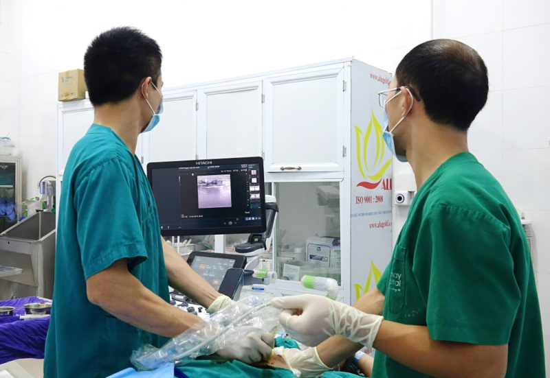 Các bác sĩ lĩnh vực điện quang can thiệp tại Bệnh viện Bãi Cháy thực hiện kỹ thuật hút u vú lành tính bằng chân không dưới hướng dẫn của siêu âm (VABB).