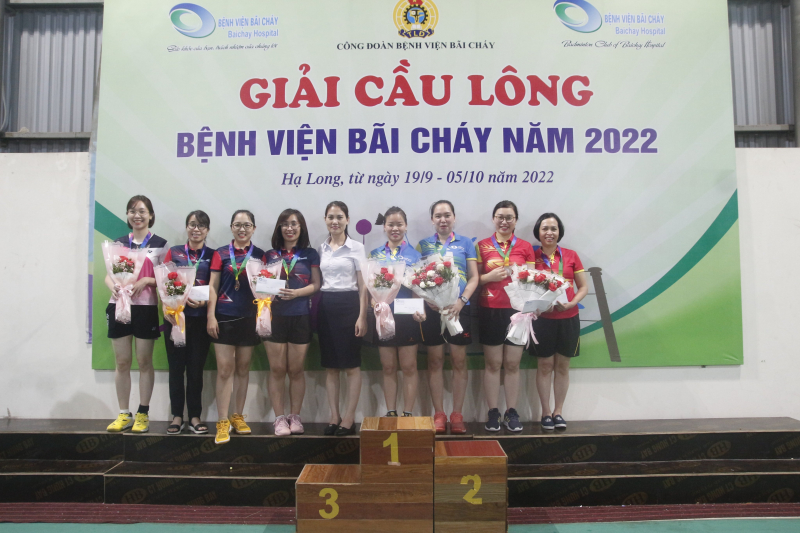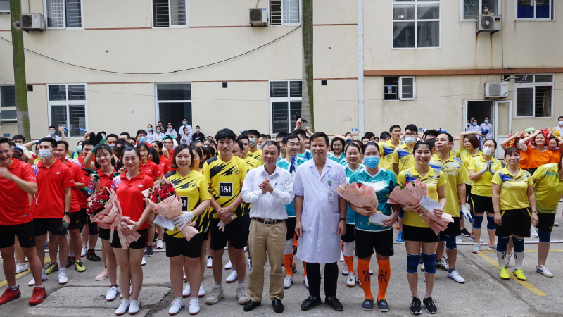 TTND,BSCKII Lê Ngọc Dũng, Giám đốc Bệnh viện tặng hoa và trao giải cho các chị em tham gia hoạt động thể dục thể thao.