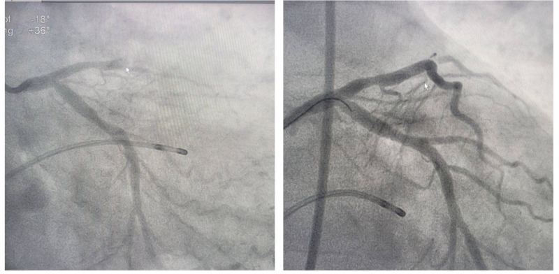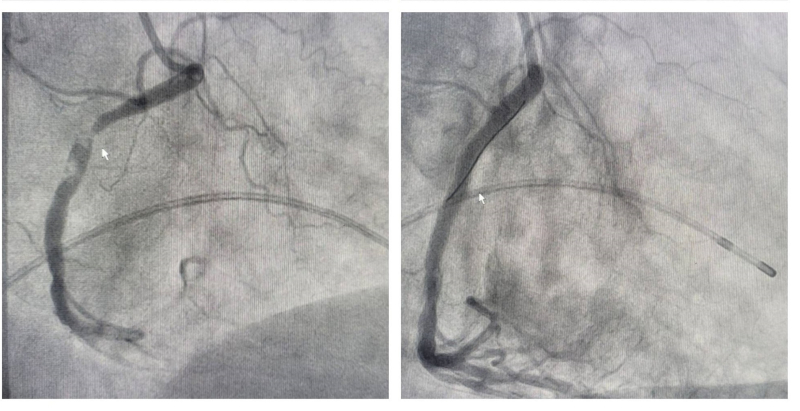 Hình ảnh các nhánh mạch vành tắc trước can thiệp (trái) và được tái lưu thông sau can thiệp (phải)