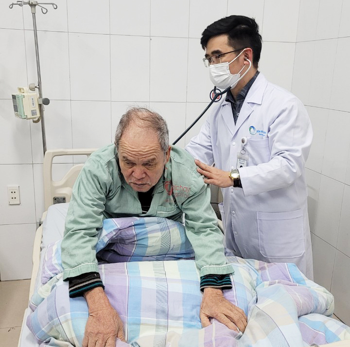 Bệnh nhân Hoàng H H (71 tuổi, trú tại TP Hạ Long, Quảng Ninh) có tiền sử đái tháo đường, nhập viện trong tình trạng đau ngực trái dữ dội, khó thở, lơ mơ, huyết áp tụt, mạch giao động từ 32-135 ck/ph. Sau thăm khám, thực hiện các xét nghiệm chẩn đoán tại giường cấp cứu, các bác sĩ chẩn đoán nhồi máu cơ tim ấp giờ đầu, tiên lượng nguy tử vong cao nếu không xử trí kịp thời. Bệnh nhân khẩn trương được chuyển lên phòng can thiệp mạch, đặt máy tạo nhịp tạm thời cấp cứu ổn định nhịp tim và chụp mạch vành cấp cứu.