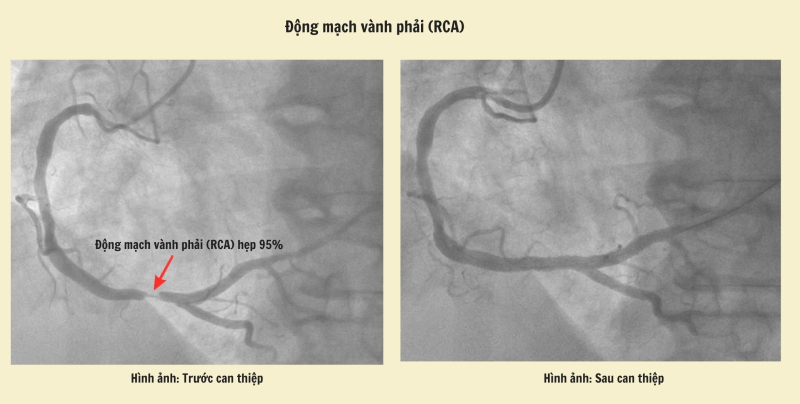 vành phải hẹp 95%; Động mạch liên thất trước tắc gần hoàn toàn đoạn 1–2.