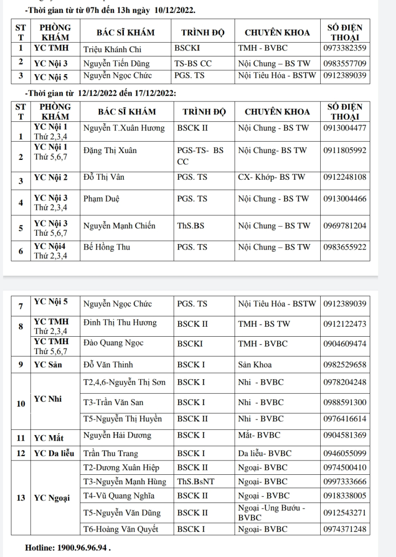Lịch khám bệnh theo yêu cầu tại bệnh viện Bãi Cháy từ 10 đến 17 tháng 12 năm 2022