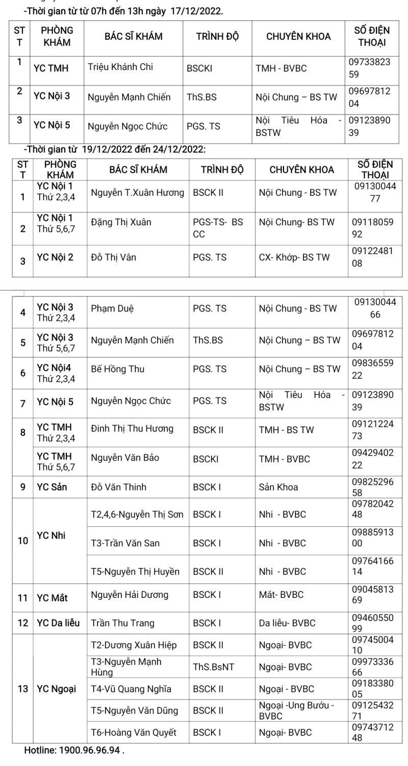 Lịch khám bệnh theo yêu cầu tại Bệnh viện Bãi Cháy từ 17 đến 24 tháng 12 năm 2022
