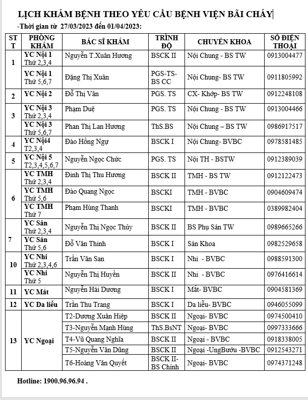 Lịch khám chữa bệnh theo yêu cầu của Bệnh viện Bãi Cháy từ 27/03 đến 01/04/2023