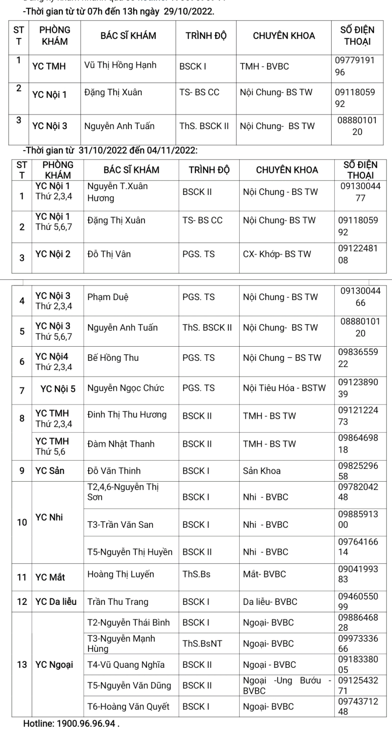Lịch khám chữa bệnh yêu cầu từ 29/10 đến 04/11 năm 2022 tại Bệnh viện Bãi Cháy