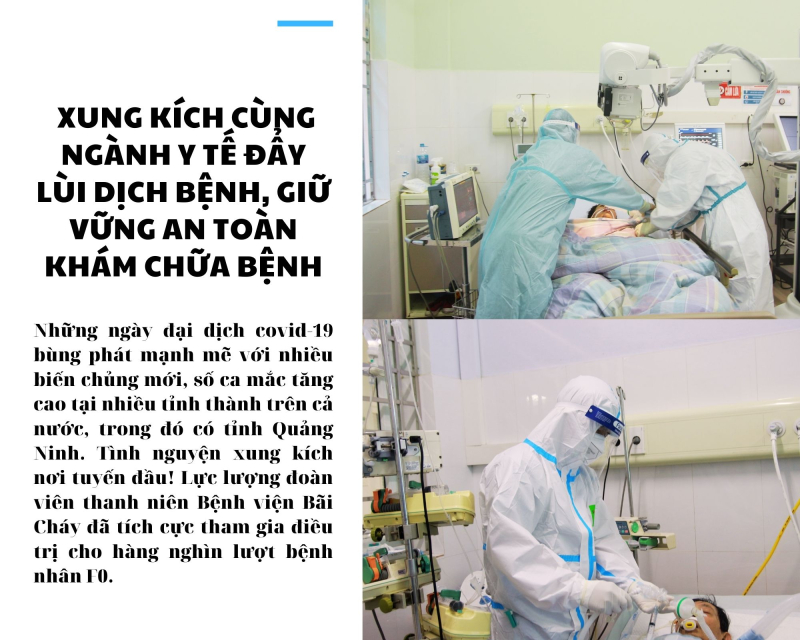 Những ngày đại dịch covid-19 bùng phát mạnh mẽ với nhiều biến chủng mới, số ca mắc tăng cao tại nhiều tỉnh thành trên cả nước, trong đó có tỉnh Quảng Ninh. Tình nguyện xung kích nơi tuyến đầu! Lực lượng đoàn viên thanh niên Bệnh viện Bãi Cháy đã tích cực tham gia điều trị cho hàng nghìn lượt bệnh nhân F0. Nhiều ca bệnh nặng và rất nặng phải lọc máu liên tục, thở máy, lọc máu HD, mở màng phổi hút khí liên tục, ECMO…đã được điều trị khỏi, góp phần hoàn thành nhiệm vụ chính trị của bệnh viện, cùng Ngành Y tế không để bệnh nhân Covid-19 không có nơi điều trị.