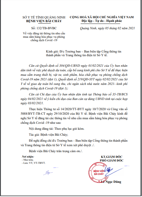 Nội dung đăng tải cung cấp thông tin về cung ứng hàng hóa phục vụ phòng chống dịch bệnh cho Bệnh viện Bãi Cháy 2021/02/05 22:16