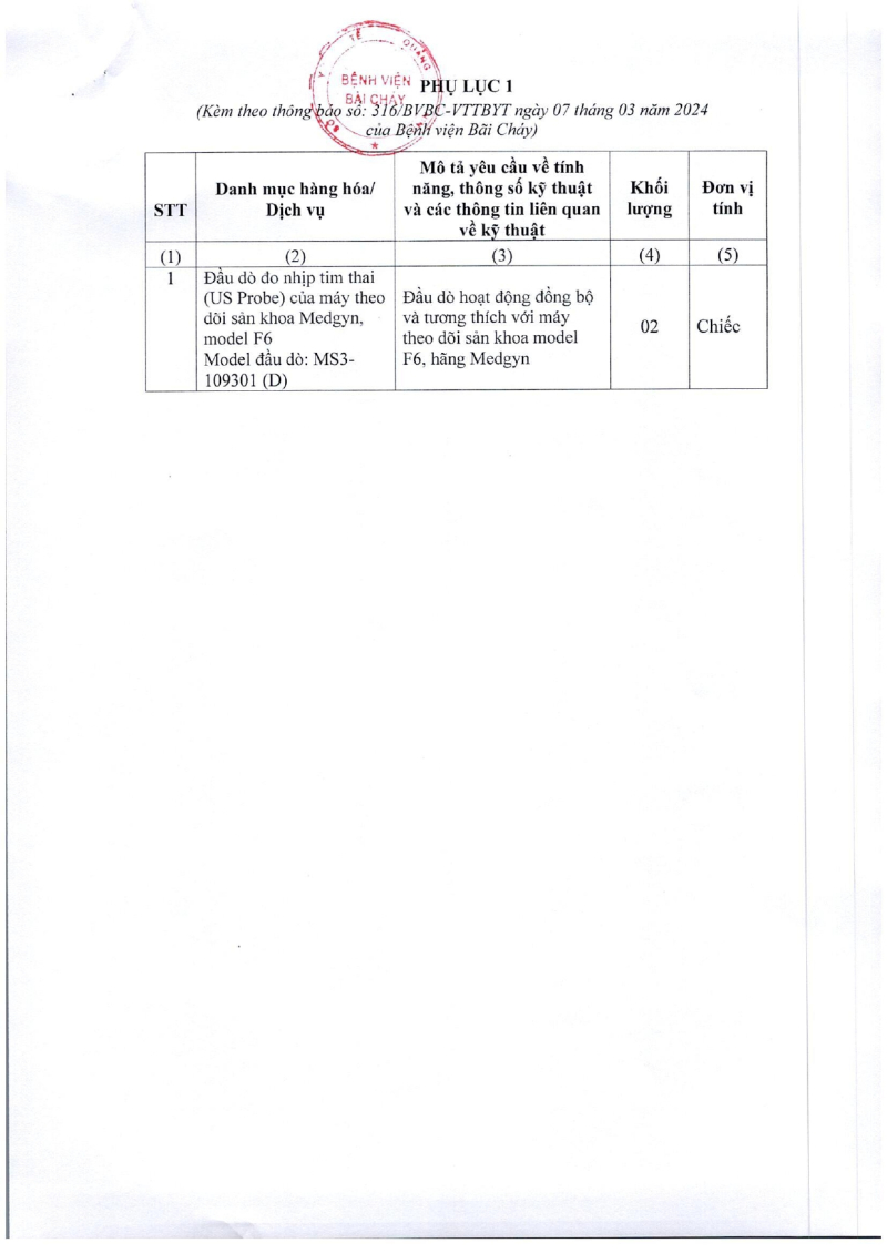 Thông báo 316 nhu cầu mua sắm thay thế đầu dò tim thai 2024/03/08 08:08 Thông báo 316 nhu cầu mua sắm thay thế đầu dò tim thai