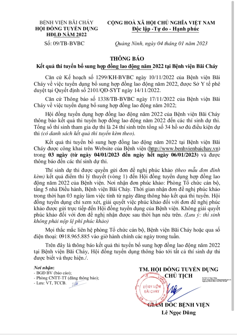 Thông báo kết quả thi tuyển bổ sung hợp đồng lao động năm 2022 của Bệnh viện Bãi Cháy 2023/01/04 10:09