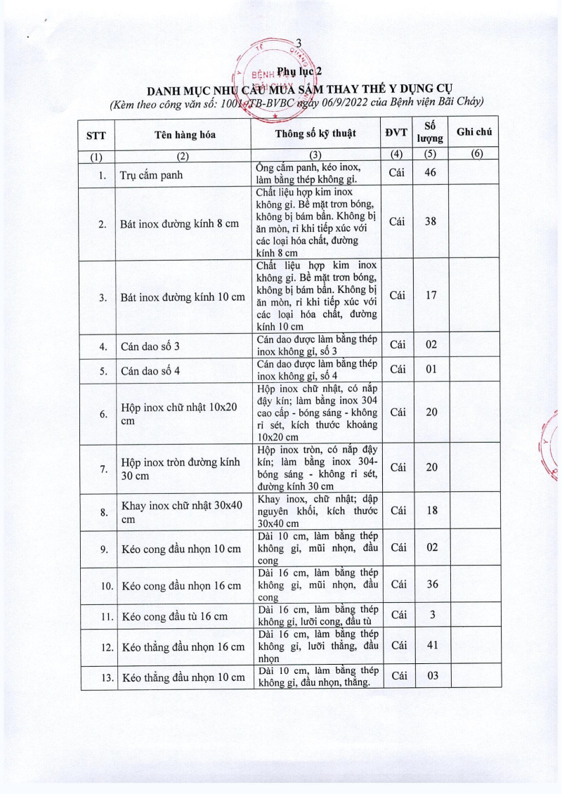 Bệnh viện Bãi Cháy ban hành thông báo số 1001/BVBC-TBYT ngày 6/9/2022 về nhu cầu mua sắm thay thế y dụng cụ đợt I - năm 2022.