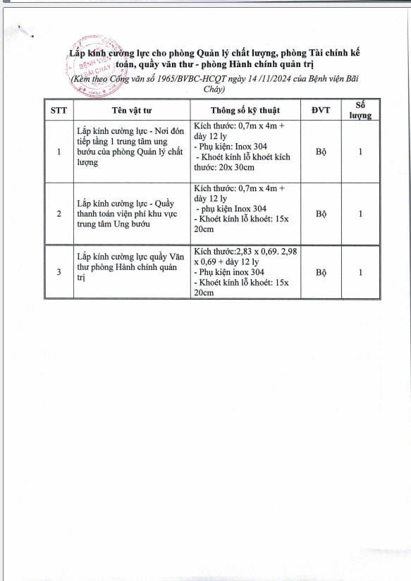 Thông báo số 1965 về nhu cầu lắp kính cường lực cho khoa, phòng Bệnh viện Bãi Cháy