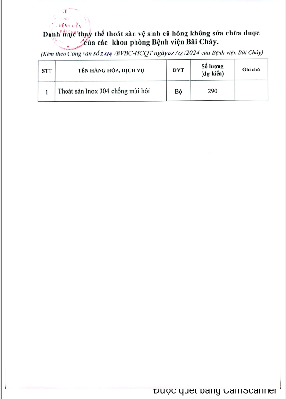 Thông báo số 2114 về nhu cầu thay thế thoát sàn vệ sinh cũ hỏng không sửa chữa được của các khoa phòng Bệnh viện Bãi Cháy 2024/12/02 02:26