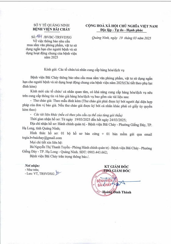 Thông báo số 471 về nhu cầu mua sắm văn phòng phẩm, vật tư sử dụng ngắn hạn cho người bệnh và hoạt động của Bệnh viện 2025/03/19 06:27