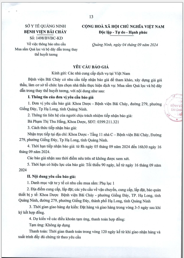 Thông báo số 1813/BVBC-VTTBYT về nhu cầu mua sắm vật tư cho máy lọc máu liên tục phục vụ công tác khám, chữa bệnh năm 2024 -2025
