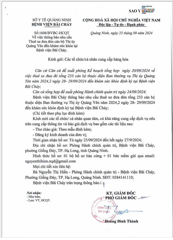 Thông báo số 1838 về nhu cầu báo giá xây dựng dự toán thay biến tần, bo gọi thang máy Bệnh viện
