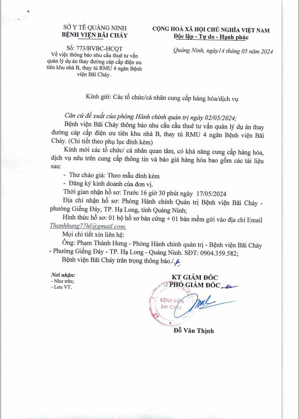 Thông báo số 1325/BVBC-HCQT về nhu cầu lắp ống khói cho máy phát điện của Bệnh viện Bãi Cháy