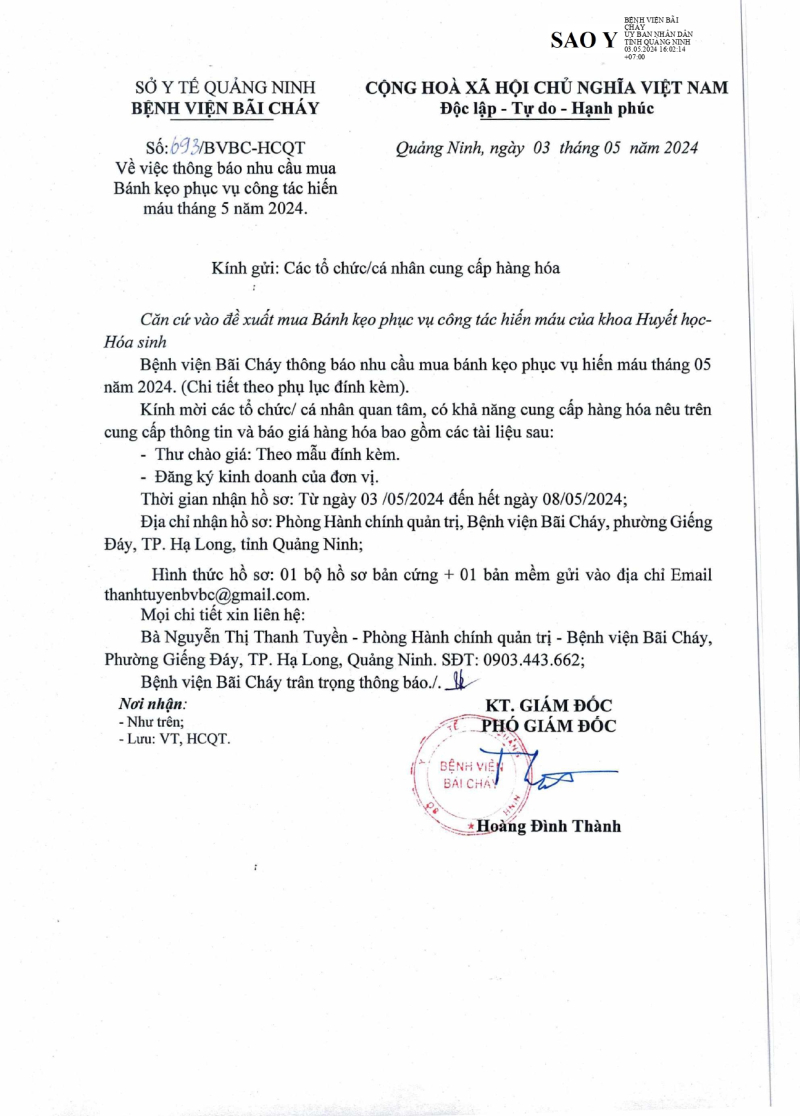 Thông báo số 1034/BVBC-HCQT về nhu cầu mua mới máy điều hòa cũ hỏng không sửa chữa được