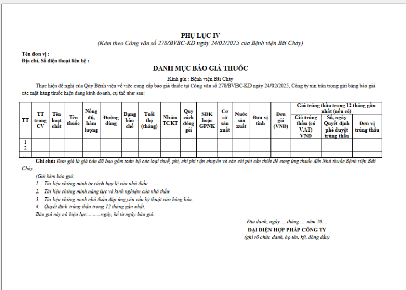 Thông báo sô 278 mời báo giá thuốc cho nhà thuốc bệnh viện